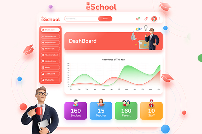 Educational software system with features like Exam & Gradebook, Parents Collaboration, Timetable & Attendance, Fees Management, SMS Integration, Certificate Generator, Multiple Dashboards, Student Admission, News Management, Report Center, User Management, Employee/Teacher Login, Custom Student Remarks, Examination, Finance, and Students/Parents Login.